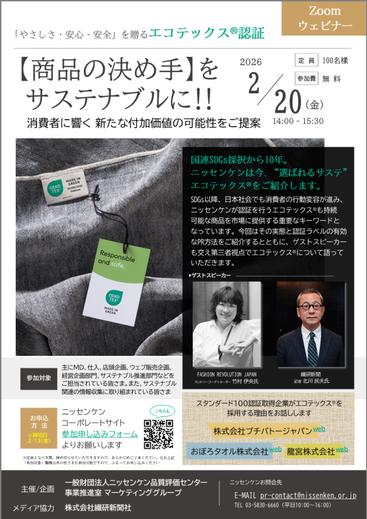 わたしたちニッセンケンは〖この機をさらにビジネスチャンスにつなげたい企業の皆さま〗向けに、アジアで唯一のエコテックスⓇ認証機関だからできる、一歩踏み込んだ「消費者に選ばれるサステナブル=エコテックスⓇ認証」をご提案いたします。繊維製品、皮革製品、ファッション雑貨等の企画・生産・取扱いをされている企業の「サステナブルな商品展開」をお考えの皆さま、ぜひ本ウェビナーにふるってご参加ください!!