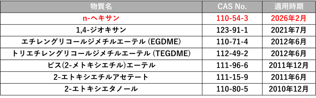 また、VOCs含有量に関する規制では、2026年6月より新たにn-ヘキサン(CAS:110-54-3)、二硫化炭素(CAS:75-15-0)、塩化ビニル(CAS:75-01-4)が規制物質として追加される予定です。