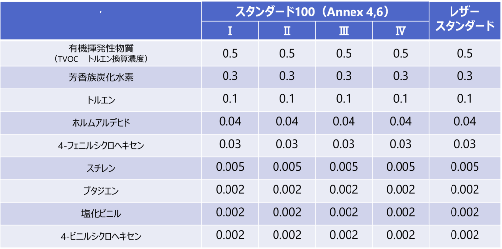 表2 エコテックス®各認証におけるVOCs放散量の規制値 (単位:mg/㎥)