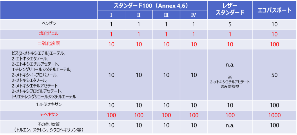 表3 エコテックス®各認証におけるVOCs含有量の規制値 (単位:mg/kg)
