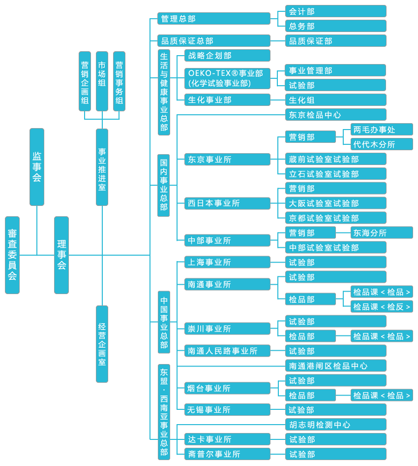 | 服务网点 | 【本部】 〒111-0051 东京都台东区藏前2-16-11 8F ■事业推进室 / 检测咨询 电话 : 03-5809-3934 ■管理总部 / 联系行政、管理部门 电话 : 03-3861-2341 传真 : 03-3861-4280 【日本】 生活与健康事业总部[战略企划部 / OEKO-TEX®事业部(化学试验事业部)/生化事业部 生化组] 东京事业所[藏前Lab/立石Lab/营销部 代代木支所/营销部 两毛办事处] 东京检品中心 中部事业所[中部Lab/营销部 东海支所] 西日本事业所[大阪Lab/京都Lab/营销部(大阪市西区)] 【中国】 上海事业所[试验部] 南通事业所[试验部/检查部 检查科<检品>/检查部 检查科<检布>] 崇川事业所[试验部/检查部] 南通人民路事业所[试验部] 无锡事业所[试验部] 南通港闸区检品中心 烟台事业所[试验部/检查部] 【越南】 胡志明检测中心 【孟加拉】 达卡事业所[试验部] 【印度】 斋普尔事业所[试验部] |