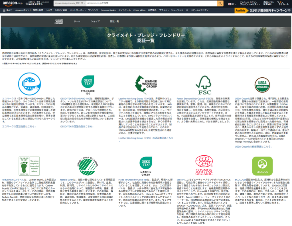 気候変動対策の一環としてAmazonが運営する『環境保護に役立つ「サステナブルな製品」を、消費者がより簡単に見つけられるようにする制度』です。同社の独自認証2種類に加え、「スタンダード100」や「メイドイングリーン」など40種類の第三者認証が登録されています。信頼性が高く、透明性があり、地球環境の保護に役立つ認証に重点が置かれ、持続可能な商品を求める消費者が最適な製品を確実に選べるよう、定期的に認証状況の評価及び再評価を行っています。