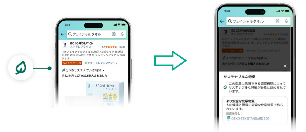 消費者は、Amazonのウェブサイトで製品を購入する際に、商品に付いている「クライメイト・プレッジ・フレンドリー」バッジ(葉のアイコン)で認証の詳細を確認することができます。