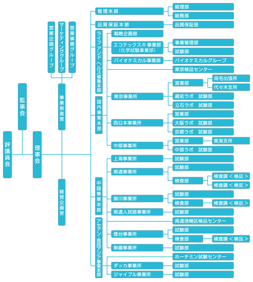 | 拠点 | 【本部】 〒111-0051 東京都台東区蔵前2-16-11 8F ■事業推進室 / 試験等お問い合わせ窓口 TEL : 03-5809-3934 ■管理本部 / 総務・管理部門お問い合わせ窓口 TEL : 03-3861-2341 FAX : 03-3861-4280 【日本】 ライフ アンド ヘルス事業本部 [戦略企画部/エコテックス®事業部(化学試験事業部)/バイオケミカル事業部 バイオケミカルグループ] 東京事業所[蔵前ラボ/立石ラボ/営業部 代々木支所/営業部 両毛出張所] 東京検品センター 中部事業所[中部ラボ/営業部 東海支所] 西日本事業所[大阪ラボ/京都ラボ/営業部(大阪市西区)] 【中国】 上海事業所[試験部] 南通事業所[試験部/検査部 検査課<検品>/検査部 検査課<検反>] 崇川事業所[試験部/検査部 検査課<検品>] 南通人民路事業所[試験部] 無錫事業所[試験部] 南通港閘区検品センター 煙台事業所[試験部/検査部 検査課<検品>] 【ベトナム】 ホーチミン試験センター 【バングラデシュ】 ダッカ事業所[試験部] 【インド】 インド ジャイプル事業所[試験部] |
